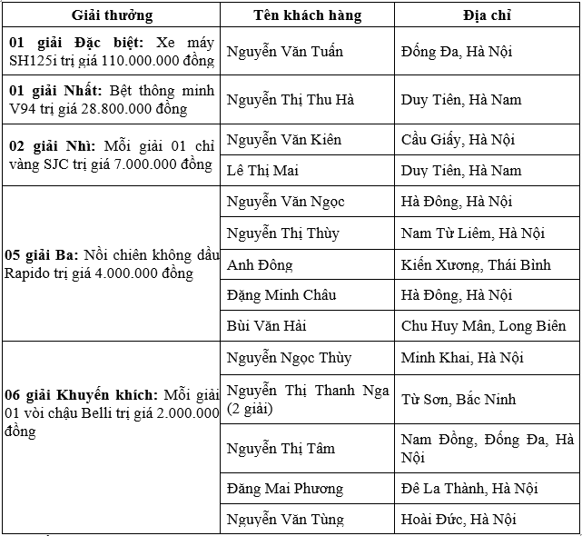 01 giải Đặc biệt: SH 125i trị giá 110.000.000 đồng.