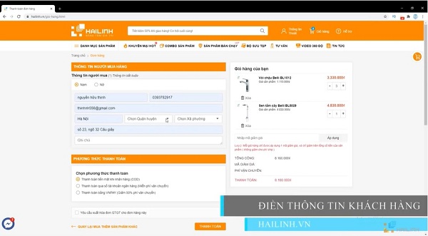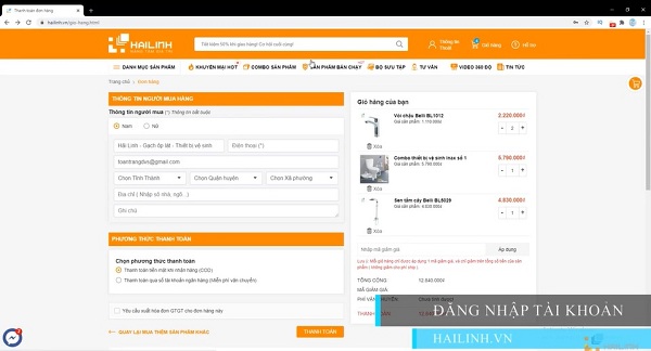 Bước 4: Đăng nhập tài khoản vào hailinh.vn, điền đầy đủ các trường thông tin: Họ và Tên, Số điện thoại, Địa chỉ giao hàng, Phương thức thanh toán. Chuyên viên chăm sóc khách hàng của Hải Linh sẽ liên hệ lại.