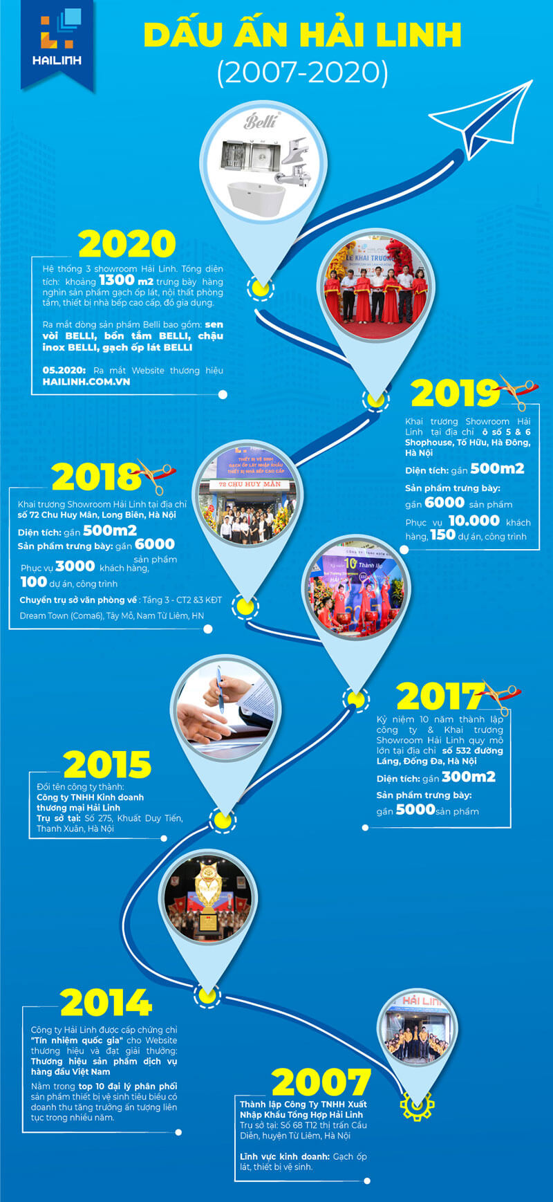 Trải qua 13 năm hình thành và phát triển, Hải Linh đã trở thành nhà phân phối uy tín hàng đầu, nơi hội tụ của nhiều thương hiệu nổi tiếng, đáp ứng được nhu cầu đa dạng của khách hàng. Với hệ thống 3 showroom lớn (tổng diện tích gần 1300 m2) tại Hà Nội, trưng bày đầy đủ các mẫu gạch ốp lát, thiết bị vệ sinh, thiết bị nhà bếp cao cấp, Hải Linh tin rằng có thể phục vụ được khách hàng một cách tốt nhất. Riêng trong năm 2019, Hải Linh đã phục vụ gần 10.000 khách hàng, đồng hành cùng 150 dự án, công trình lớn nhỏ. Với tầm nhìn dài hạn, Hải Linh không ngừng nỗ lực phát triển, trong năm 2020 Hải Linh đã cho ra mắt dòng sản phẩm Belli bao gồm sen vòi Belli, bồn tắm Belli, chậu inox Belli. Và đặt biệt cuối năm 2020 chúng tôi liên kết với một số nhà máy sản xuất gạch mang thương hiệu BELLI thuộc dòng sản phẩm trung, cao cấp, hứa hẹn mang đến trải nghiệm chất lượng, tối ưu cho người tiêu dùng.
